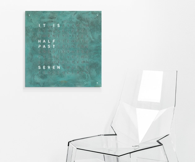 The 45 x 45 cm QLOCKTWO CLASSIC is mounted on the wall like a picture, or it can be set up in freestanding position with the acrylic glass base. It is held by magnets and can easily be changed.