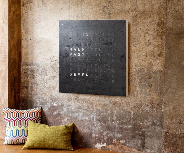 QLOCKTWO LARGE features an impressive front cover in a 90 x 90 cm format. It is available in various surface finishes and more than 20 languages. Its striking form gives every room a modern sense of time.