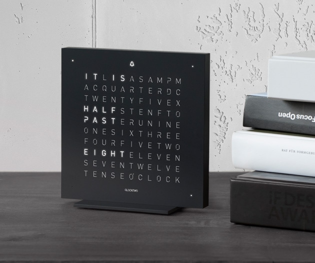 QLOCKTWO TOUCH is a precision table clock with an alarm function. It also displays the time using a matrix of letters, spelling out the time in words. In addition to its compact format, the simple operation makes it a popular design item.